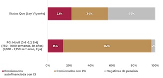 Los pensionados con pensión autofinanciada pasan del 22% en la ley actual al 15% con la reforma. Los pensionados con pensión garantizada pasan del 34% con la ley actual al 82% con la reforma. Las negativas de pensión (que dan derecho a recuperar los recursos de la Afore) pasan del 44% con la ley actual al 4%.
