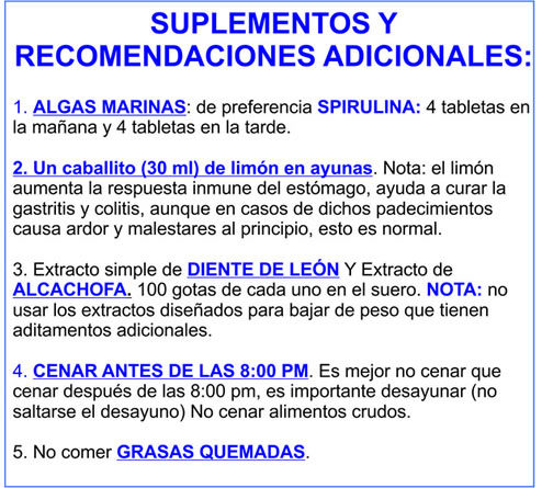 NOTA DE LOS SÍNTOMAS DE DESINTOXICACIÓN O CRISIS CURATIVA: En los primeros dos meses el cuerpo al curarse puede manifestar síntomas desagradables, aunque no peligrosos, que derivan del proceso curativo como diarreas, erupciones cutáneas, cansancio, cambios de humos, entre otros. Esto es normal y significa que el cuerpo se está curando.