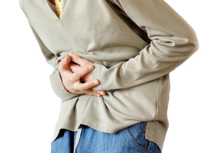 boy holding hands on his stomach over white background, painAna Teresa Abreu