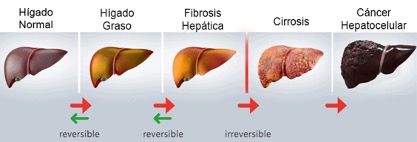Su presencia, inflama al hígado y daña sus células. El problema es que el hígado intenta desinflamarse pero con el tiempo después de estar intentando repararse, termina con cicatrices (fibrosis) que dificultan su funcionamiento.